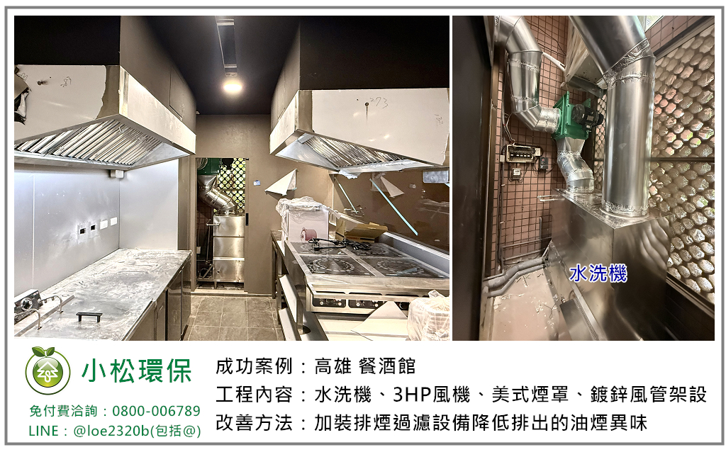 小松環保 於 高雄 餐酒館,完成完成通風工程施作,包括 水洗機、3HP風機、美式煙罩、鍍鋅風管架設,施作後抽風順暢,能有效抽離油煙、改善廚熱氣。