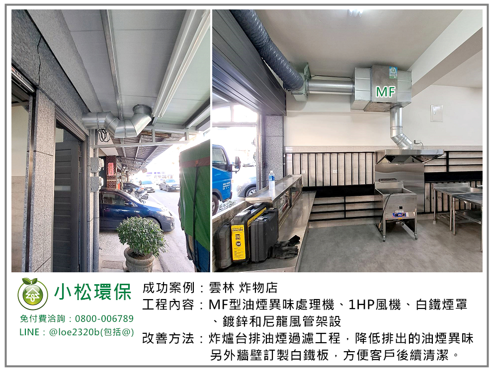 小松環保於 雲林 炸物店 ,完成裝設一式餐飲業油煙/異味處理設備,包括 MF型油煙異味處理機、1HP風機、白鐵煙罩、鍍鋅和尼龍風管架設。MF型相當於靜電機的效果,油煙去除效率90%以上,異味去除效率30%-50% ,適用於中低油煙或油煙粒徑較大,且低異味的餐飲業者。