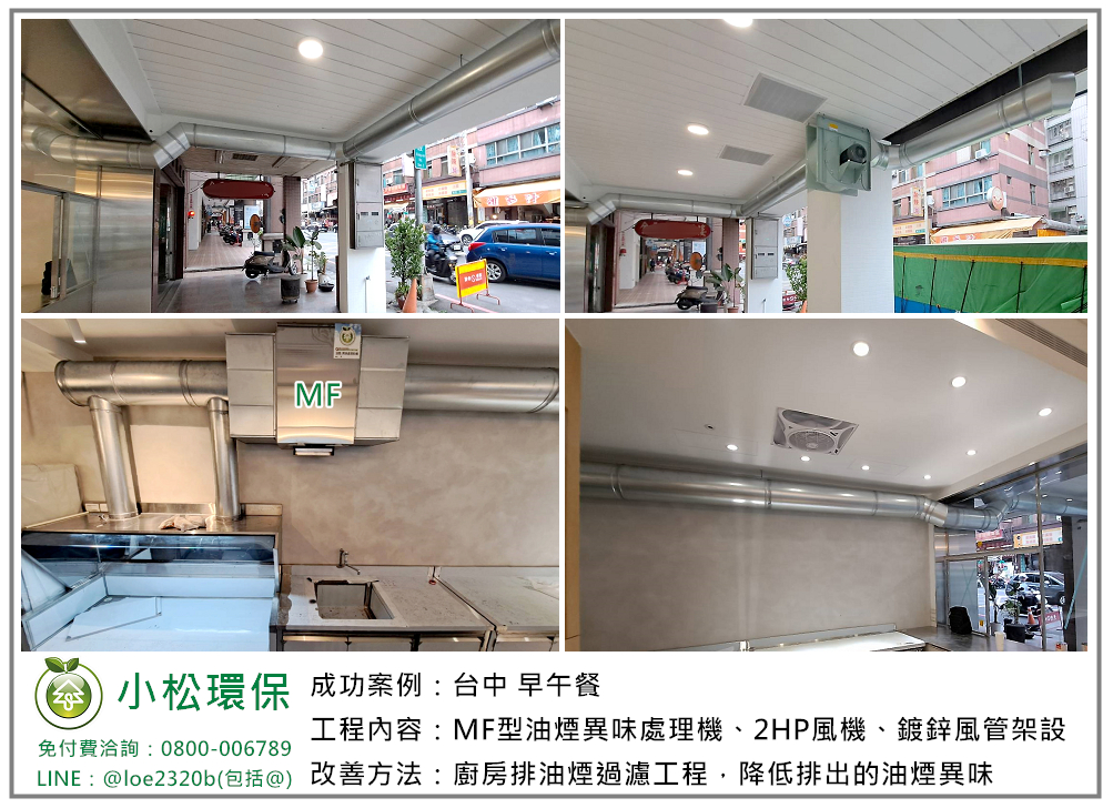 小松環保於 台中 早午餐 ,完成裝設一式餐飲業油煙/異味處理設備,包括 MF型油煙異味處理機、2HP風機、鍍鋅風管架設。MF型相當於靜電機的效果,油煙去除效率90%以上,異味去除效率30%-50% ,適用於中低油煙或油煙粒徑較大,且低異味的餐飲業者。