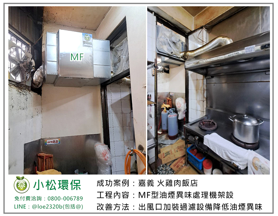 小松環保於 嘉義 火雞肉飯店 ,完成裝設一式餐飲業油煙/異味處理設備,包括 MF型油煙異味處理機架設。MF型相當於靜電機的效果,油煙去除效率90%以上,異味去除效率30%-50% ,適用於中低油煙或油煙粒徑較大,且低異味的餐飲業者。