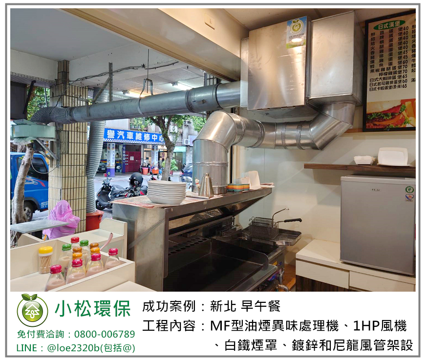小松環保於 新北 早午餐 ,完成裝設一式餐飲業油煙/異味處理設備,包括 MF型油煙異味處理機、1HP風機、白鐵煙罩、鍍鋅和尼龍風管架設,MF型相當於靜電機的效果,油煙去除效率90%以上,異味去除效率30%-50% ,適用於中低油煙或油煙粒徑較大,且低異味的餐飲業者。